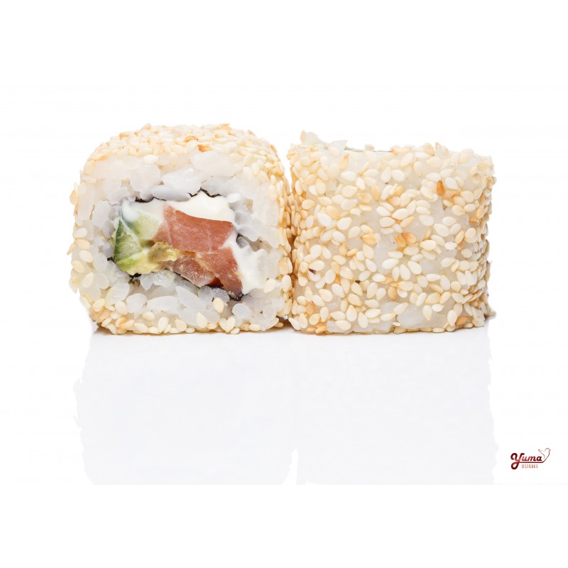 Kūpināts lasis, gurķis, avokado, kausēts siers, sezama sēklas